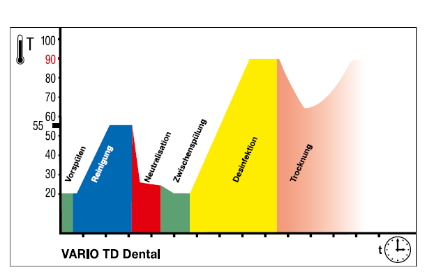Après une phase de lavage principale intensive se déroule ensuite une désinfection thermique > 90 °C et avec un temps de maintien.