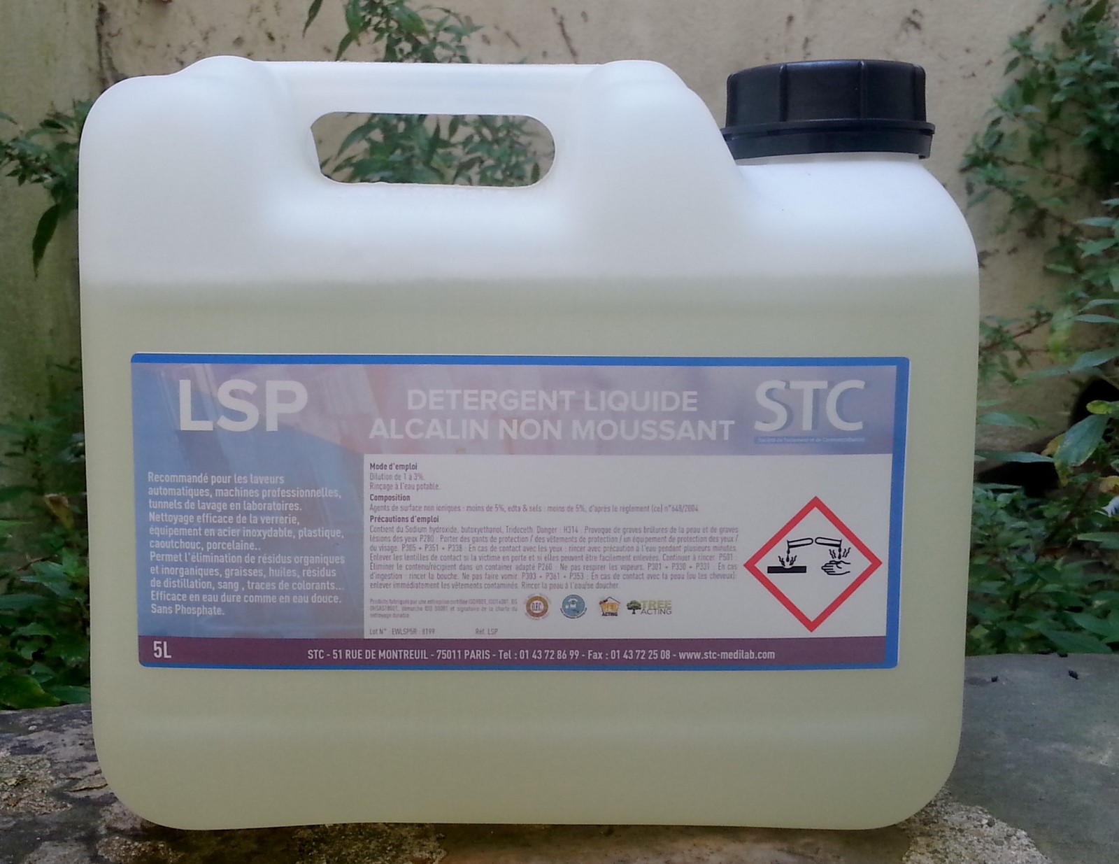 Détergent alcalin liquide pour verrerie de laboratoire, instruments de chirurgie, anesthésie et biberons - A base d'hydroxyde de sodium - Sans phosphate - Fort pouvoir détachant - Elimine les résidus de sang, d'albumine et déchets alimentaires - Bidon de 5 litres